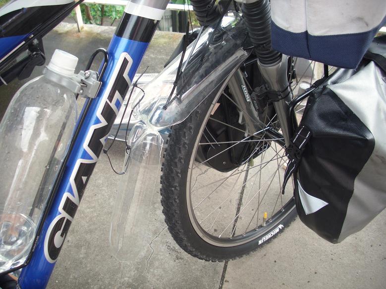 リヤフェンダーは、出発前にペットボトルで自作したんだけど、