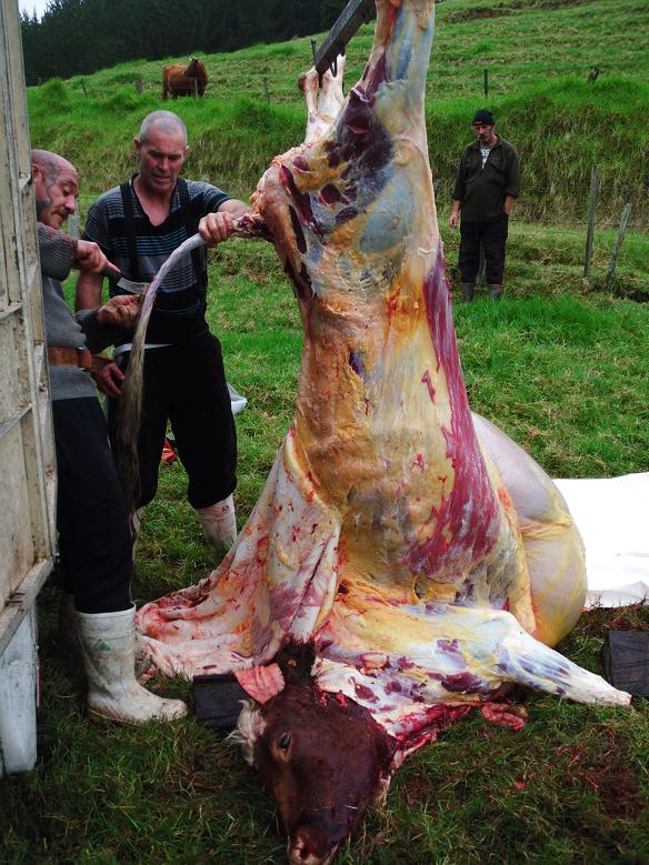 【皮を剥がされた牛。このあと、しっぽと頭を取られた。】