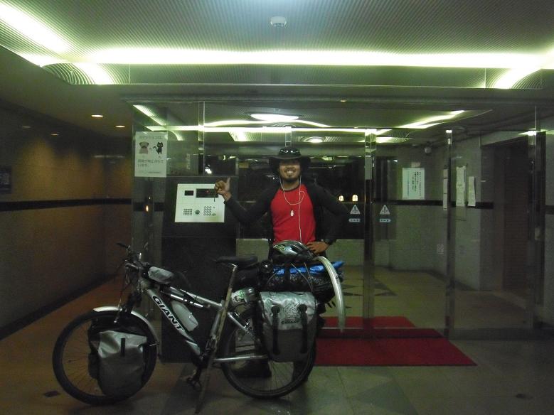 自転車と荷物を同時には持てないので、先に荷物をロビー(屋内)において、