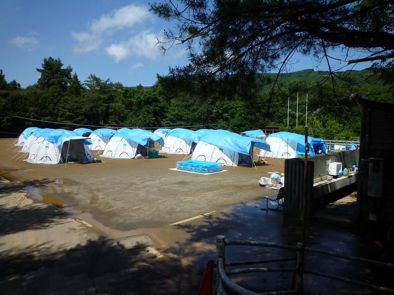 【体育館の周りには、テント村や仮設住宅が】