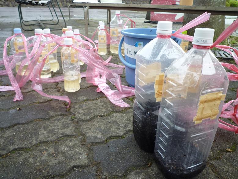 Making traps wasn't difficult.We made a hole on a plastic bottle first, then put sugar, vinegar and sake in it.