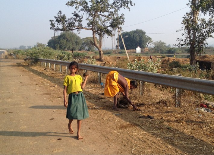 左の草むらから、100頭くらいのヤギの群れと、ヤギ使いが現れた。