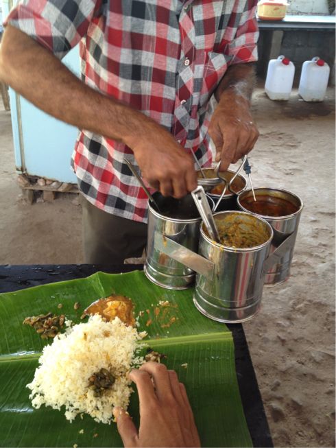 【バナナの葉の上に、カレーと野菜とご飯を山盛り】