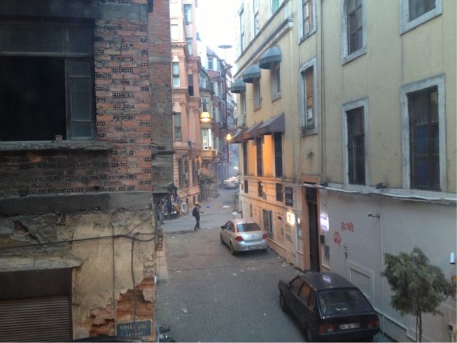 ※部屋の窓からの眺め。路地の奥は催涙ガスで白い。
